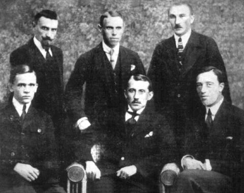 на фото: Члени Стрілецької ради у Празі в липні 1920 року. Зліва направо сидять: сотник Іван Андрух, полковник Євген Коновалець, сотник Василь Кучабський; стоять: полковник Іван Чмола, сотник Михайло Матчак, сотник Ярослав Чиж.