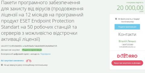Зокрема, йддеться про продовження ліцензії на 12 місяців на програмний продукт ESET Endpoint Protection Standart на 50 робочих станцій та серверів з можливістю відстрочки активації ліцензії.