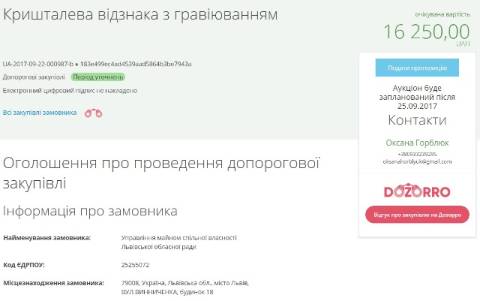 Управління майном спільної власності Львівської обласної ради оголосило закупівлю на 25 штук кришталевих відзнак з гравіюванням та встановило ціну у 16 250 гривень.