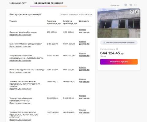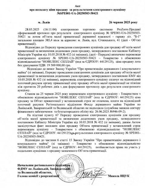 Зазначимо, під час першого аукціону наприкінці травня будівлю гаража продали фірмі львівського забудовника ТзОВ "Новелекс Сеплай" за 19,5 млн грн. Однак до 26 червня цього року будфірма так й не заплатила за нерухомість й Фонд держмайна змушений був скасувати закупівлю. Гараж повторно виставили на аукціон, однак тепер зі зниженням стартової ціни на 50%.