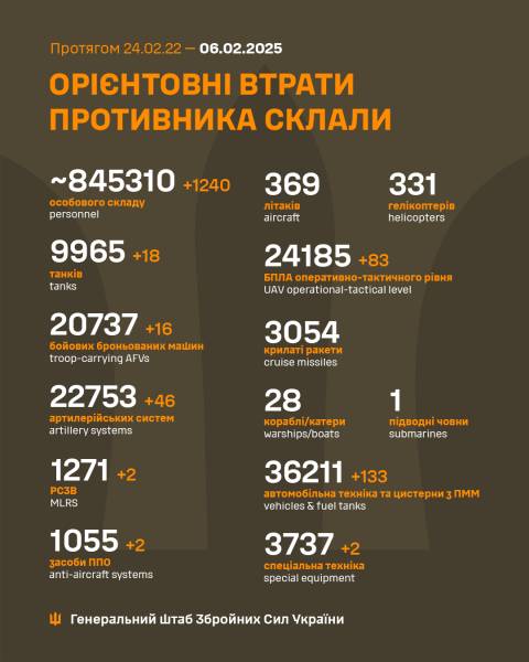 "Загальні бойові втрати противника з 24.02.22 по 06.02.25 орієнтовно склали: особового складу – близько 845310 осіб (+1240), танків – 9965 од (+18), бойових броньованих машин – 20737 од (+16), артилерійських систем – 22753 од (+46), РСЗВ – 1271 од (+2), засоби ППО – 1055 од (+2), літаків – 369 од (+0), гелікоптерів – 331 од (+0), БПЛА оперативно-тактичного рівня – 24185 (+83), крилаті ракети – 3054 (+0), кораблі /катери – 28 од (+0), підводні човни – 1 од (+0), автомобільної техніки та автоцистерн – 36211 од (+133), спеціальна техніка – 3737 (+2)" – йдеться у повідомленні.