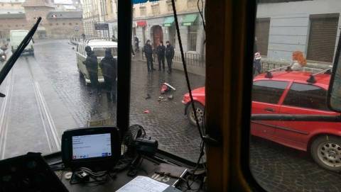 Дорожньо-транспортна пригода сталась близько дванадцятої години дня на площі Митній. Про це журналісту "Варіантів" стало відомо на місці інциденту. Червона BMW в'їхала в зелений фургон Volkswagen Тараса Павліва, більше відомого серед футбольних фанатів за прізвиськом Гладіатор. Внаслідок інциденту ніхто не постраждав, в BMW відлетів передній бампер. Винтуватця ДТП визначить суд.