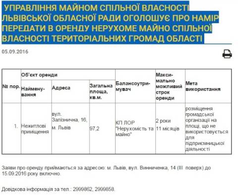 Нагадаємо, у серпені Львівська обласна рада оголосила про передачу в оренду громадській організації комунального приміщення на вул. Винниченка.