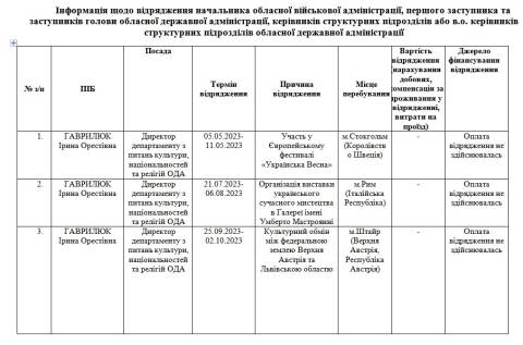 За весь час відряджень видатки на проїзд та проживання для посадовиці з обласного бюджету Львівщини не здійснювалась.
