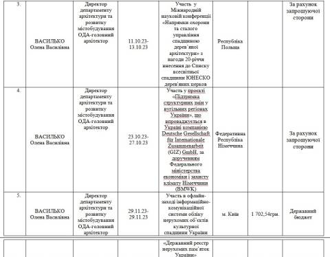Починаючи з 1 січня й до 31 грудня 2023 року директорка департаменту архітектури та розвитку містобудування Львівської ОВА Олена Василько побувала у 5 службових відрядженнях, з них 3 відрядження були у межах України, а 2 – закордонні.