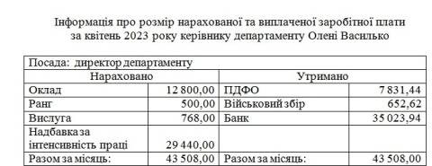 У квітні цього року директорці департаменту архітектури та розвитку містобудування Львівської ОВА Олені Василько нарахували 43 508 грн заробітної плати. Зокрема, у суму зарплати увійшли такі виплати: