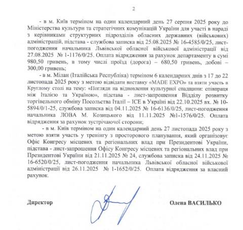 – 27 серпня – до Міністерства культури та стратегічних комунікацій України для участі в нараді з керівниками структурних підрозділів обласних державних (військових) адміністрацій (Київ). Вартість відрядження – 980,50 грн (проїзд – 680,50 грн, добові – 300 грн);