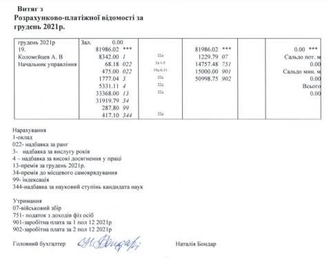 У грудні минулого року начальнику управління архітектури та урбаністики Львівської міської ради Антону Коломєйцеву нарахували 81 986,02 грн заробітної плати. Зокрема, у цю суму увійшли такі виплати:
