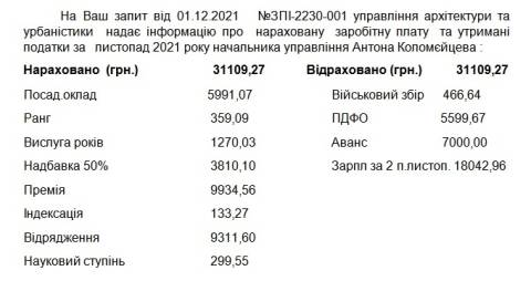 У листопаді цього року начальнику управління архітектури та урбаністики Львівської міської ради Антону Коломєйцеву нарахували 31 109,27 грн заробітної плати. Зокрема, у цю суму увійшли такі виплати: