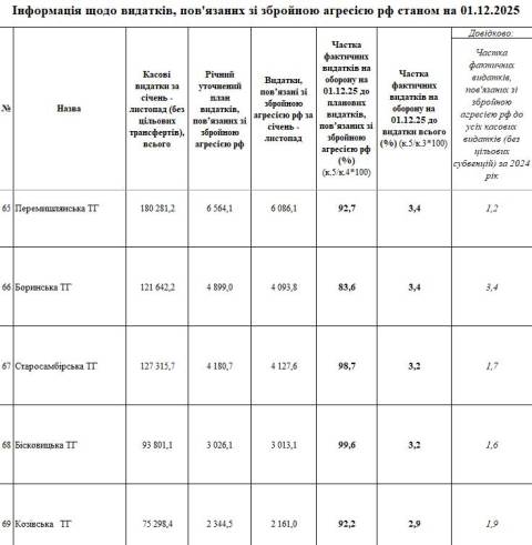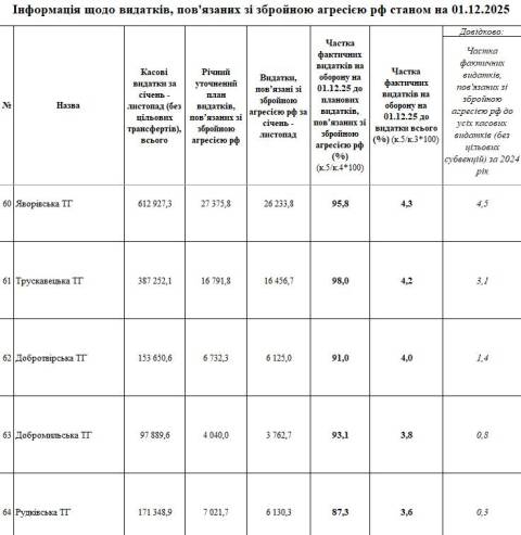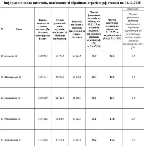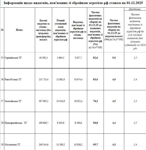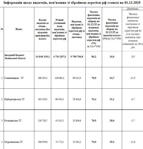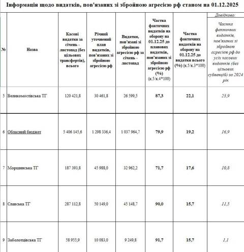 Найвищу частку оборонних витрат серед загальних видатків зафіксували у Сокільницькій громаді – 34,7%, Підберізцівській – 31,1%, Розвадівській – 28%, Мурованській – 25,3% та Великомостівській – 22,1%.