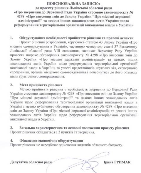 Депутатка Львівської обласної ради Ірина Гримак 30 квітня цього року зареєструвала проєкт рішення про звернення до ВРУ щодо законопроєкту № 4298 "Про внесення змін до ЗУ "Про місцеві державні адміністрації" та деяких інших законодавчих актів України щодо реформування територіальної організації виконавчої влади в Україні".