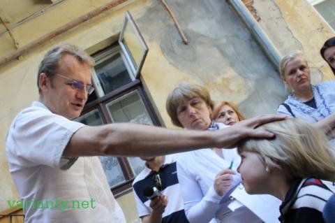 Мер Львова Андрій Садовий на двориковому брифінгу після можливого побиття біля Ратуші.