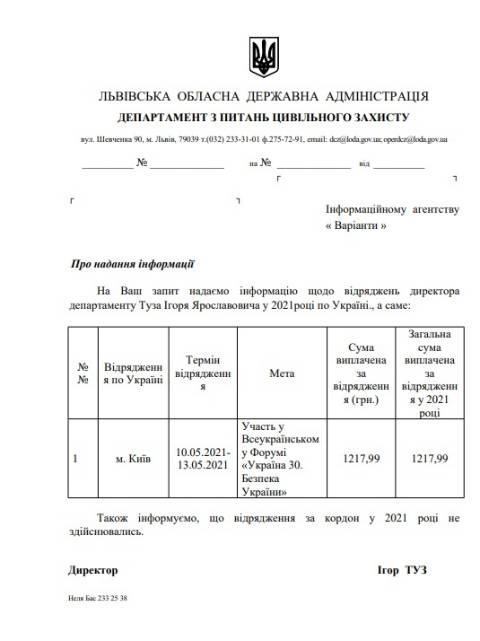Цього року директор департаменту з питань цивільного захисту Львівської ОДА Ігор Туз отримав понад тисячу гривень на відрядження.