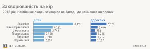 За даними Міністерства охорони здоров'я України, з початку року на кір захворіли більше 50 тисяч українців, а 17 осіб – померли. Це найвищий показник захворюваності за всі роки незалежності України. Хвороба почала активно поширюватися тими областями, в яких рівень вакцинації є найнижчим. Львівська область стала лідером за кількістю зареєстрованих випадків захворюваності на кір і однією з антилідерів за рівнем охоплення щепленнями проти кору.
