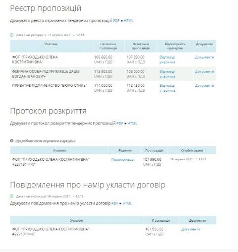 Аукціон стартував 11 червня, участьу ньому взяли ФОП Олена Приходько (107 990 грн), ФОП Богдан Даців (108 000 грн) та приватне підприємство "Бюро-Стиль" (112 430 грн). Переможцем обрали Олену Приходько, а початкова закупівлі становила 114 000 грн.
