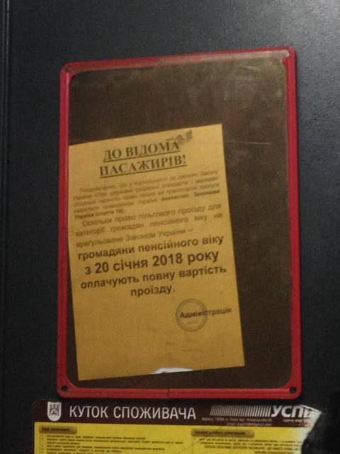Однак сьогодні, близько 18:30 год., журналіст Варіантів виявив у маршрутці №53, яка підпорядкована приватному перевізнику "Успіх БМ", оголошення, в якому теж йшлось про те, що із 20 січня пенсіонери таки платитимуть повну вартість проїзду у львівських маршрутках.