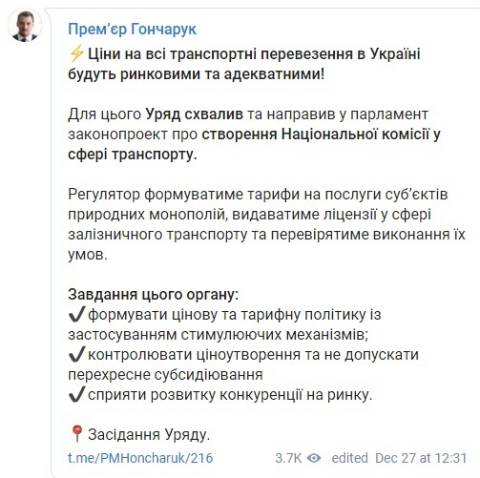 Сьогодні, 27 грудня, уряд схвалив та направив до Верховної Ради законопроект про створення Національної комісії у сфері транспорту.