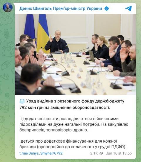 "Ці додаткові кошти розподіляються військовими підрозділами на дуже нагальні потреби. На закупівлю боєприпасів, тепловізорів, дронів" – написав Денис Шмигаль.
