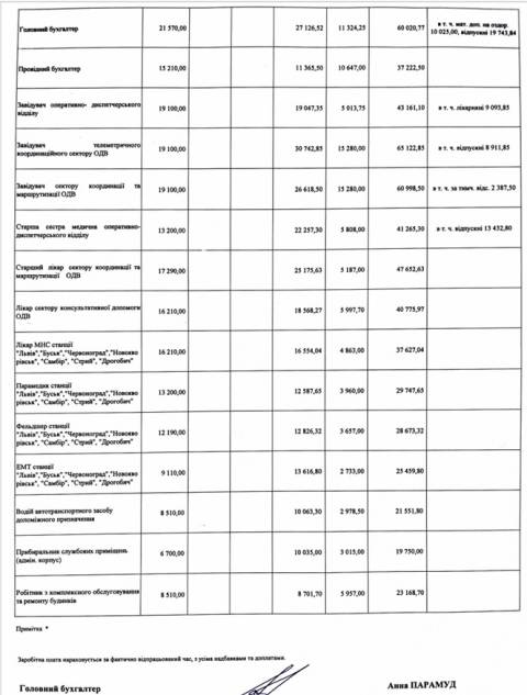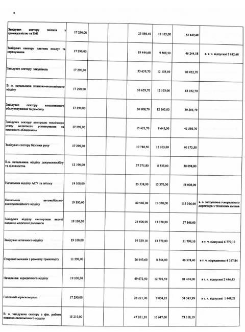 Заступник Васька з медичної роботи отримав 98 145,51 грн нарахованої зарплати, заступник з міжнародної співпраці та медицини катастроф – 74 400,23 грн, заступник з економічних питань – 148 274,06 грн, заступник з технічних питань – 257 112,60 грн, медичний директор – 127 901,30 грн.