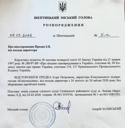 "Підписав розпорядження про відсторонення від посади керівника КП "Комунальник" Ігоря Предка на підставі ухвали Галицького районного суду міста Львова. Термін відсторонення – до 24 квітня 2026 року" – наголосив Залівський.