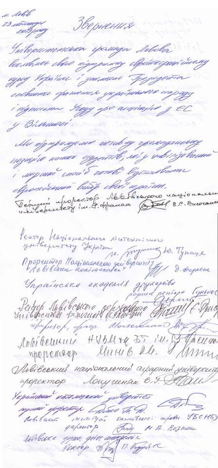 Свої підписи під зверненням поставили представники керівництва ЛНУ ім. І.Франка, НУ Львівська політехніка, Академії друкарства та ін. ВНЗ.