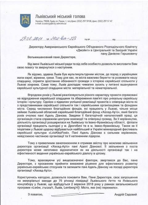 Відтак, сьогодні міський голова Львова Андрій Садовий звернувся з офіційним листом до Директора Американського Єврейського Об’єднаного Розподільчого Комітету "Джойнт" у Центральній та Західній Україні Даніеля Гершовича з проханням залишити пані Адель на своїй посаді і дати змогу і надалі розвивати діяльність центру "Хесед-Ар'є".
