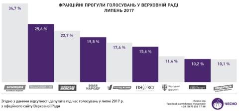 Найбільше голосувань пропустили народні обранці від "Батьківщини" (34,7%) та позафракційні депутати (25,6%), найменше – депутати від "Блоку Петра Порошенка" (присутні під час 89,9% голосувань) та "Самопомочі" (присутні під час 89,8% голосувань).