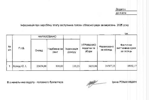 У вересні цього року заступнику голови Львівської обласної ради Юрію Холоду нарахували 24 587,23 грн заробітної плати. Зокрема, у цю суму увійшли такі виплати:
