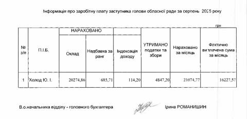 У серпні цього року заступнику голови Львівської обласної ради Юрію Холоду нарахували 21 074,77 грн заробітної плати. Зокрема, у цю суму увійшли такі виплати: