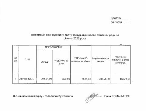 У січні цього року заступнику голови Львівської обласної ради Юрію Холоду нарахували 24 454 грн заробітної плати. Зокрема, у цю суму увійшли такі виплати: