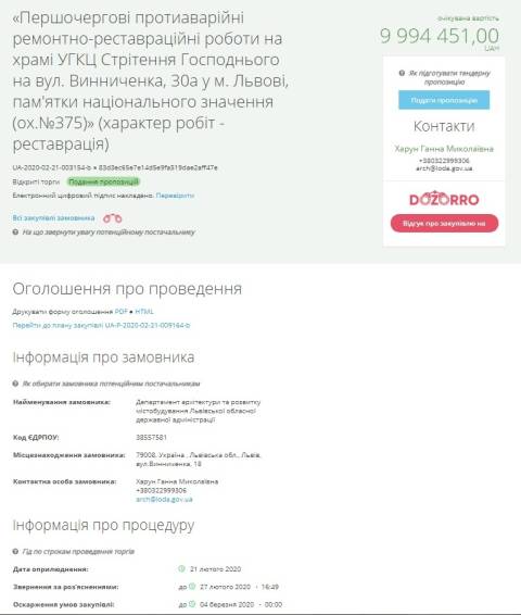 Департамент архітектури та розвитку містобудування Львівської обласної державної адміністрації оголосив тендер у системі ProZorro на протиаварійні ремонтно-реставраційні роботи храму УГКЦ Стрітення Господнього на вул. Винниченка, 30а, які переможець тендеру має здійснити до 31 грудня 2023 року.