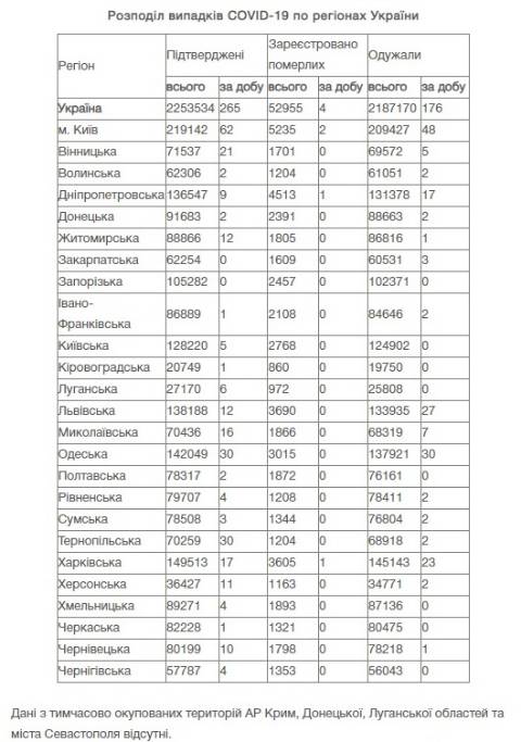 Натомість в Україні зареєстрували 2 253 534 випадки зараження коронавірусом, з них 52 955 людей померли, а 2 187 170 людей – одужали. За добу захворіли на коронавірус 481 особа.
