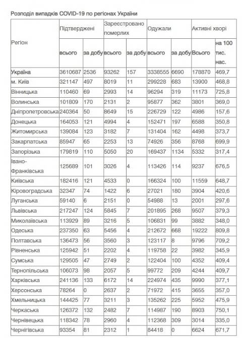 Натомість в Україні зареєстрували 3610687 випадків зараження коронавірусом, з них 93262 людей померли, а 3338555 людей – одужали. За добу захворіли на коронавірус 2536 осіб.