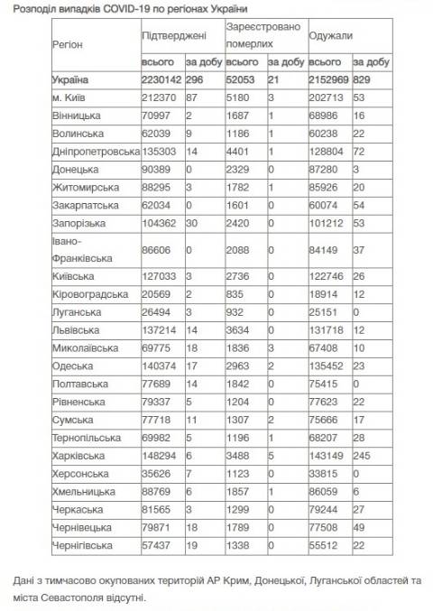 Натомість в Україні зареєстрували 2 230 142 випадки зараження коронавірусом, з них 52 053 людей померли, а 2 152 969 людей – одужали. За добу захворіли на коронавірус 296 осіб.
