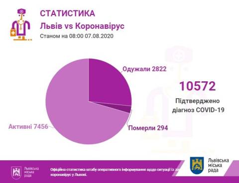 Станом на 08.00 год у Львові та Львівщині підтвердили 10572 випадки інфікування коронавірусом, з них 294 випадки смертельні, а 2822 пацієнти одужали.