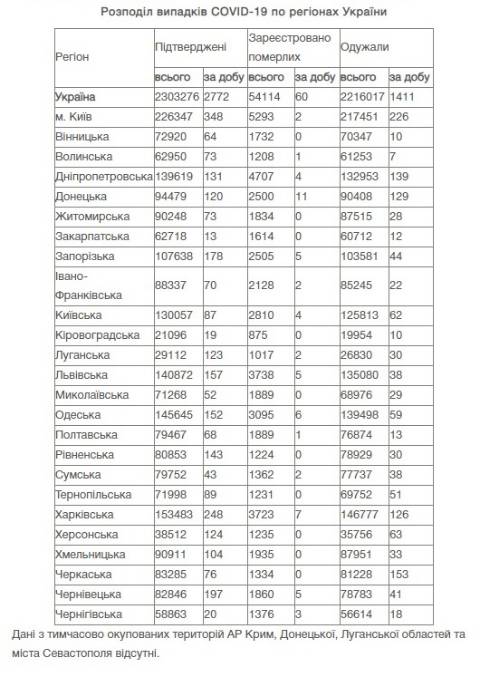 Натомість в Україні зареєстрували 2 303 276 випадків зараження коронавірусом, з них 54 114 людей померли, а 2 216 017 людей – одужали. За добу захворіли на коронавірус 2 772 особи.
