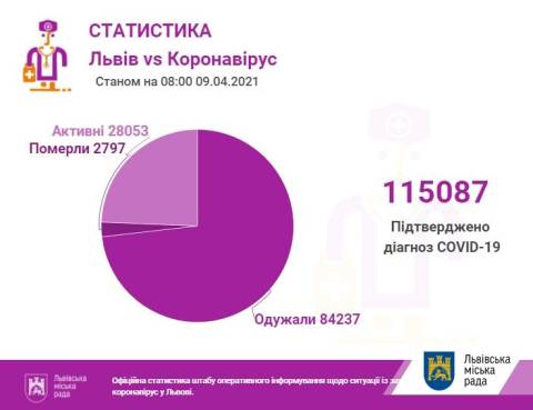 Станом на 08.00 год у Львові та Львівщині підтвердили 115087 випадків інфікування коронавірусом (з них у Львові – 56628), з них 2797 випадків смертельні (з них у Львові – 1350), а 84237 пацієнтів одужали (у Львові – 41658).
