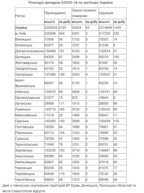 Натомість в Україні зареєстрували 2 300 504 випадки зараження коронавірусом, з них 54 054 людини померли, а 2 214 606 людей – одужали. За добу захворіли на коронавірус 2 197 осіб.