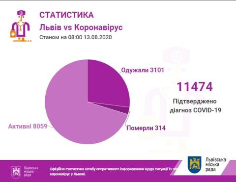 Станом на 08.00 год у Львові та Львівщині підтвердили 11474 випадки інфікування коронавірусом, з них 314 випадків смертельні, а 3101 пацієнті одужав.