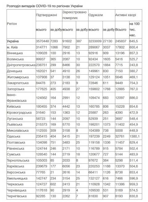 Натомість в Україні зареєстрували 3570448 випадків зараження коронавірусом, з них 91602 людей померли, а 3233009 людей – одужали. За добу захворіли на коронавірус 7283 особи.