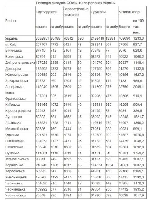 Натомість в Україні зареєстрували 3 032 951 випадок зараження коронавірусом, з них 70 842 людини померли, а 2 492 419 людей – одужали. За добу захворіли на коронавірус 26488 осіб.