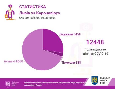 Станом на 08.00 год у Львові та Львівщині підтвердили 12448 випадків інфікування коронавірусом, з них 338 випадків смертельні, а 3450 пацієнтів одужали.