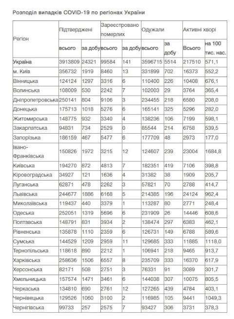 Натомість в Україні зареєстрували 3 913 809 випадків зараження коронавірусом, з них 99 584 людей померли, а 3 596 715 людей – одужали. За добу захворіли на коронавірус 24 321 особа.