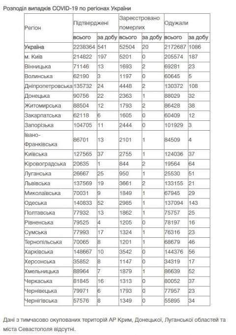 Натомість в Україні зареєстрували 2 238 364 випадки зараження коронавірусом, з них 52 504 людей померли, а 2 172 687 людей – одужали. За добу захворіли на коронавірус 541 особа.