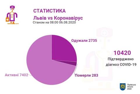 Станом на 08.00 год у Львові та Львівщині підтвердили 10420 випадків інфікування коронавірусом, з них 283 випадки смертельні, а 2735 пацієнтів одужали.
