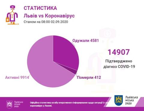 Станом на 08.00 год у Львові та Львівщині підтвердили 14907 випадків інфікування коронавірусом, з них 412 випадків смертельні, а 4581 пацієнт одужав.