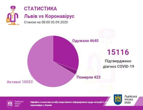 Станом на 08.00 год у Львові та Львівщині підтвердили 15116 випадків інфікування коронавірусом, з них 423 випадки смертельні, а 4640 пацієнтів одужали.