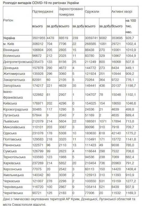 Натомість в Україні зареєстрували 3501955 випадків зараження коронавірусом, з них 88519 людей померли, а 3059741 людина – одужала. За добу захворіли на коронавірус 4478 осіб.