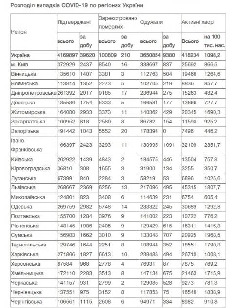 Натомість в Україні зареєстрували 4169897 випадків зараження коронавірусом, з них 100809 людей померли, а 3650854 людини – одужали. За добу захворіли на коронавірус 39620 осіб.