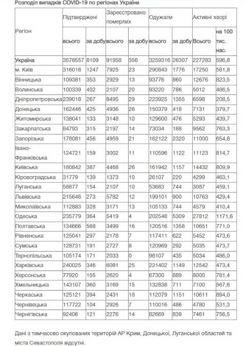 Натомість в Україні зареєстрували 3578557 випадків зараження коронавірусом, з них 91958 людей померли, а 3259316 людей – одужали. За добу захворіли на коронавірус 8109 осіб.